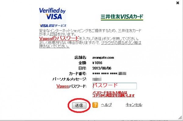 次に、visa/masterカードのパスワードを入力して、赤マル部分「送信」をクリックします。