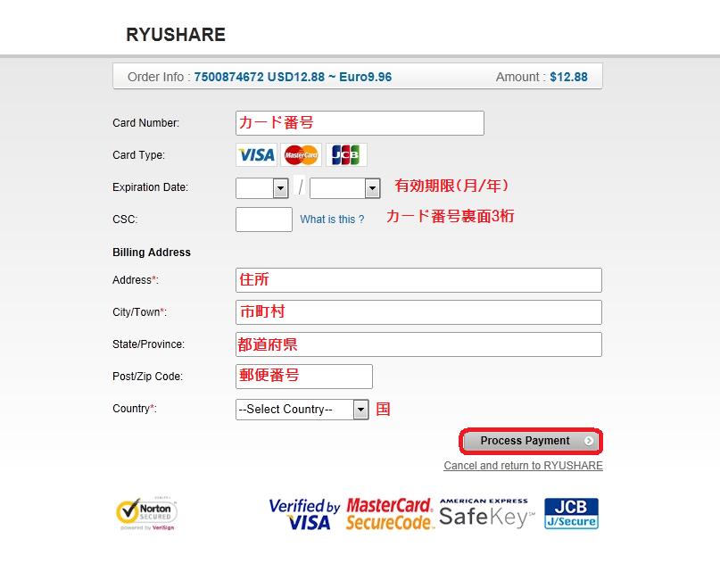 全て入力後、赤マル部分「Procces Payment」をクリックします。