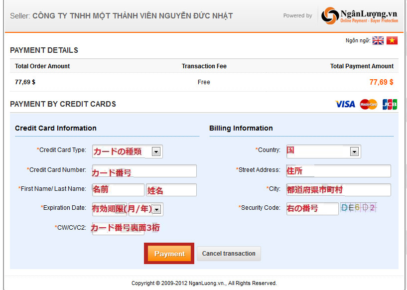 次に、visa/masterカードの入力画面に進むので、空欄を入力してください。